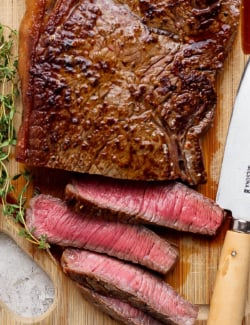 - Prep: Be sure to prep ahead by letting the steak rest, seasoned with salt, on the counter for 1 hour. This brings it to room temperature so it cooks quicker and more evenly, and lets the salt absorb deeper for better flavor throughout.
