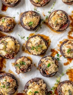 Although stuffed mushrooms are a classic appetizer, they’re super fun as a side dish too! Serve with a simple green salad or Arugula Beet Salad and Grilled Pork Chops, Grilled Ribeye, or Lemon Pepper Chicken.