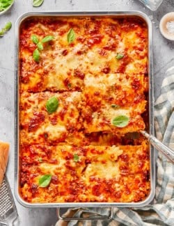 The ingredients list for this ravioli lasagna overlaps a lot with a traditional lasagna recipe (not to mention my Lasagna Dip and Skillet Lasagna). Scroll down to the printable recipe card to find the exact ingredient quantities and full recipe instructions.