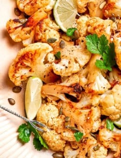 - Remove pan from oven. Sprinkle with a bit more sea salt and black pepper, if desired. Serve straight from pan, if you like – or transfer cauliflower to a serving platter. Cut the zested lime in half and squeeze the juice over the top of the cauliflower. Sprinkle with chopped cilantro to finish. Serve hot, with additional fresh lime wedges to squeeze over individual portions.