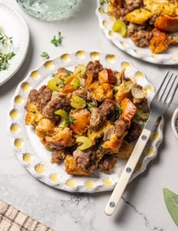 This Classic Sausage Stuffing recipe is a very traditional Thanksgiving stuffing: soft French bread, pork sausage, celery, and onions mingle with fresh herbs for a flavorful accompaniment to your turkey and mashed potatoes!