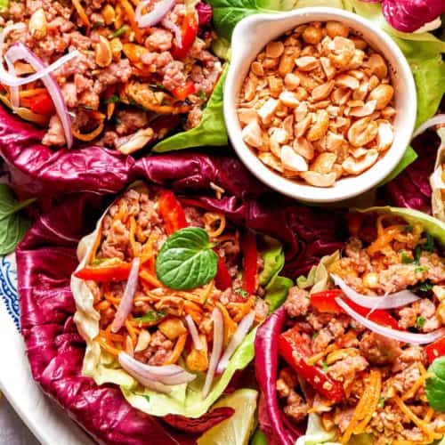 I had been sitting on this Thai Ground Pork Salad recipe for a year before I actually got around to trying it. Part of my holding off was due to Blake’s dislike for lettuce wraps. But I finally convinced myself to go for it, knowing he couldn’t possibly leave the table with two pounds of pork sitting there.