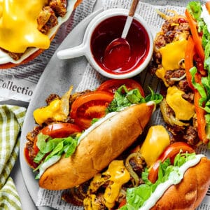 To assemble sandwiches, first spread mayo on one side of the toasted bun and ketchup on the other, if desired. Then transfer each portion of meat and cheese mixture onto individual hoagie buns. Top with lettuce and tomatoes, plus any other condiments that you like. Enjoy immediately, while hot.